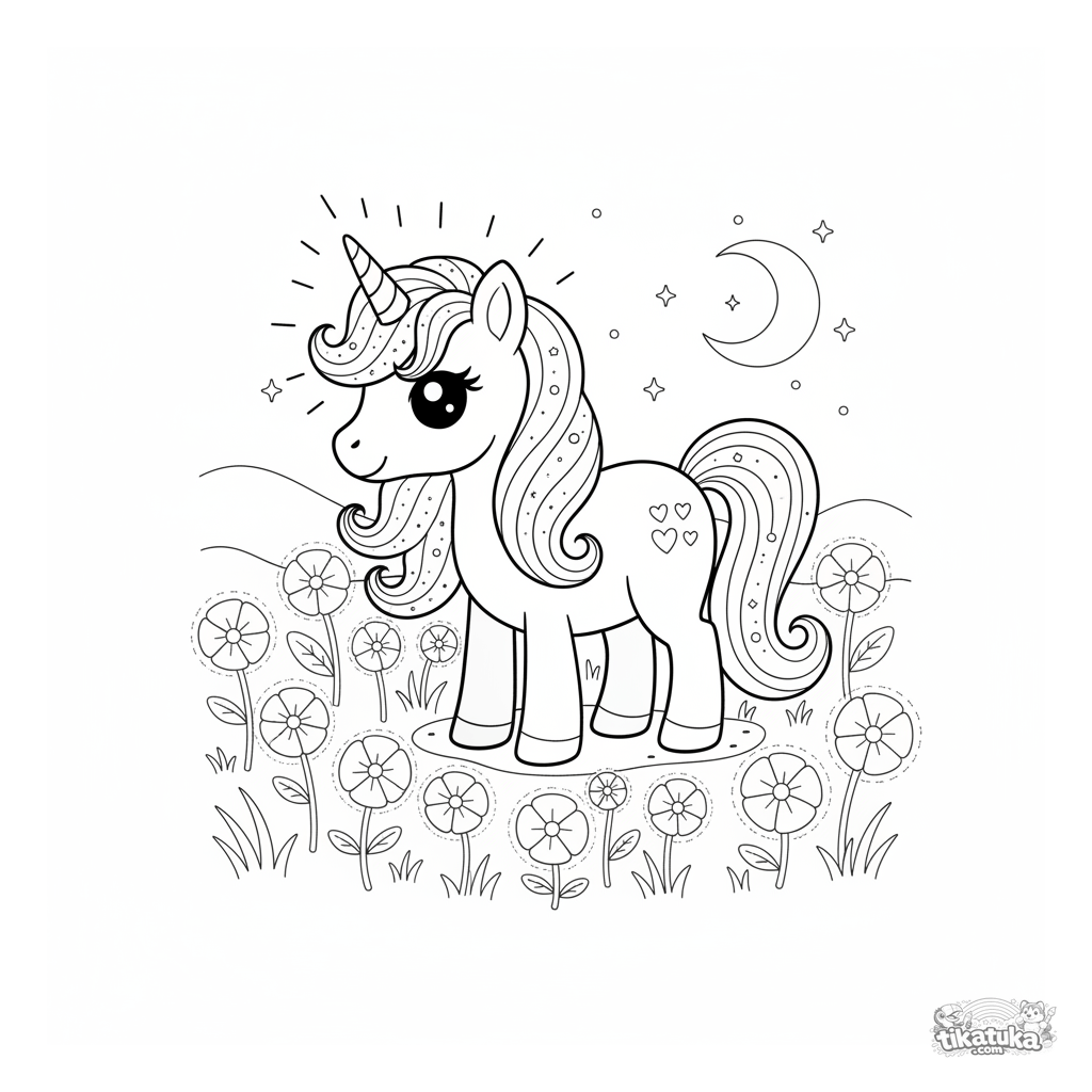 Ausmalbild eines magischen Einhorn-Ponys, das auf einer Wiese mit leuchtenden Mondblumen grast. Eine bezaubernde Szene für Mädchen von 4-6 Jahren.