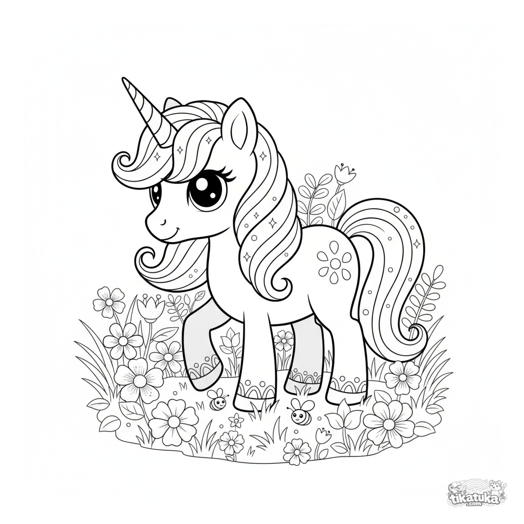 Ausmalbild eines magischen Einhorn-Ponys mit Regenbogenmähne, das auf einer verzauberten Wiese grast. Für Kinder von 6-9 Jahren. Viele Details zum Ausmalen.
