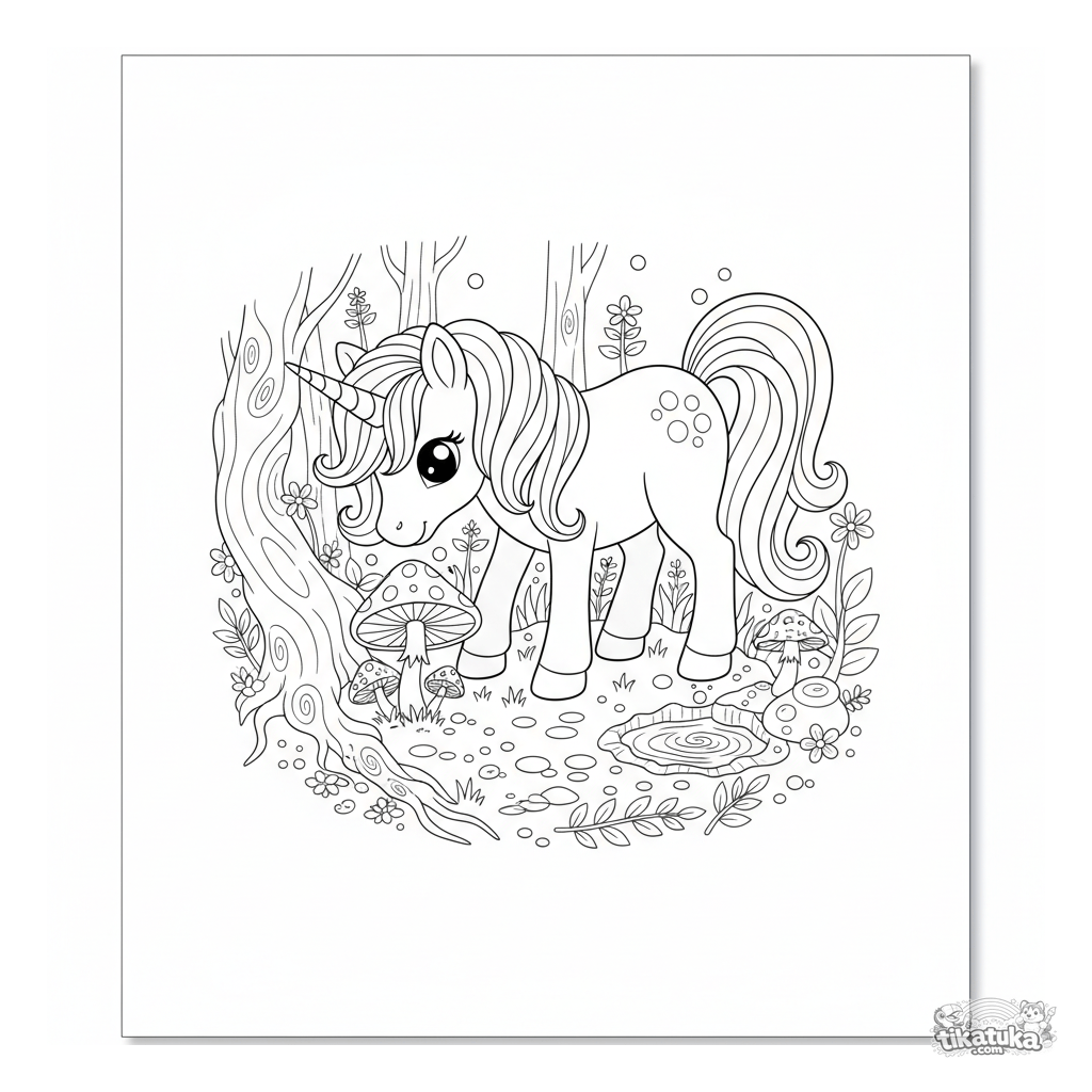 Ausmalbild eines magischen Einhorn-Ponys, das zwischen leuchtenden Pilzen in einem Zauberhain grast. Für Kinder von 6 bis 9 Jahren.
