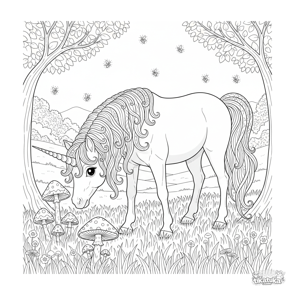 Detailliertes Ausmalbild für ältere Kinder: Ein magisches Einhorn-Pony weidet im Mondlicht in der Nähe von leuchtenden Pilzen. Hohes Detail für 7-12 Jahre.