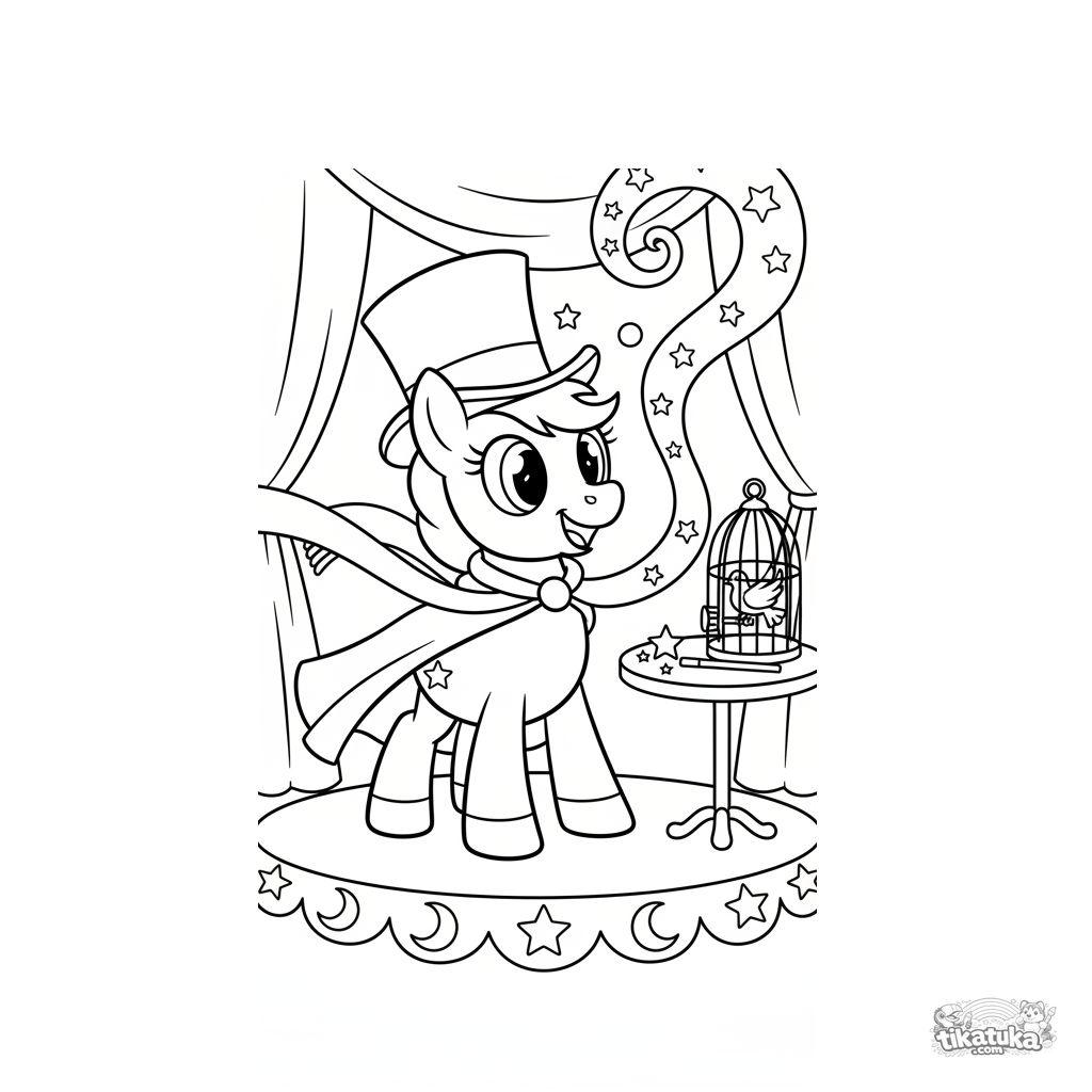 Lustiges Ausmalbild für Kinder 4-6 Jahre: Ein Zauberer-Pony zieht ein endloses Tuch aus einem Hut auf der Bühne. Heller Retro-Stil, einfache Formen.