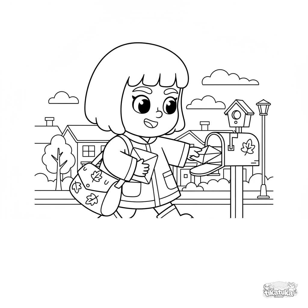 Ausmalbild für Kinder 7-9 Jahre: ein Postbote in Umhang und Stiefeln steigt vorsichtig über eine Pfütze, um Briefe im Herbstregen zuzustellen.