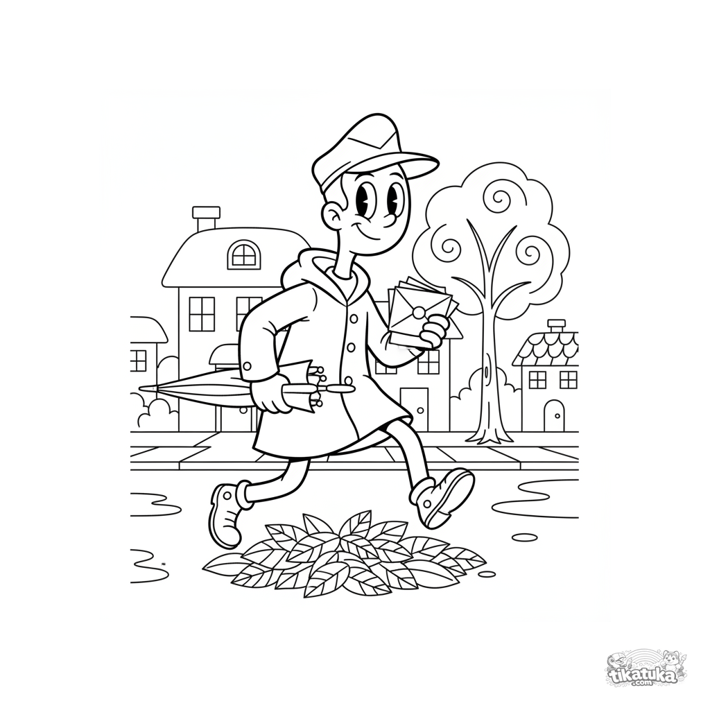 Ausmalbild für Kinder 4-6 Jahre: ein Postbote in gelbem Regenmantel geht einen nassen Gehweg entlang und liefert Briefe unter Herbstregen. Heller Charakter, klare Geschichte.