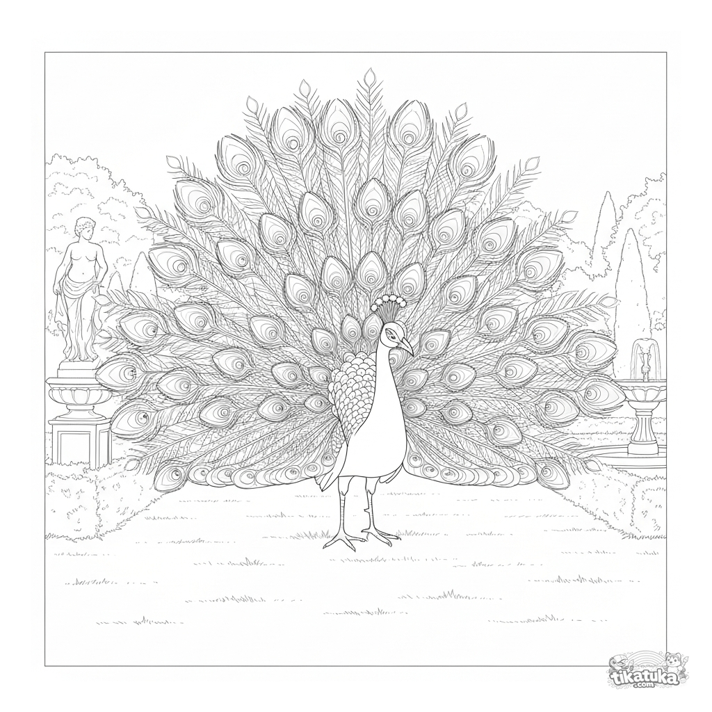Schwieriges Ausmalbild eines Pfaus im formalen Garten. Für Kinder von 8-12 Jahren. Zeigt einen detaillierten Schwanz, einen Brunnen, eine Steinstatue und geschnittene Hecken.