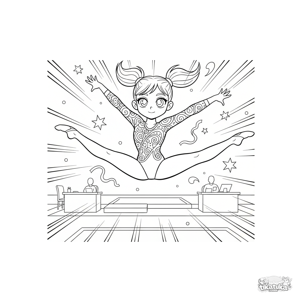 Energisches Manga-Action Ausmalbild für Mädchen 10-12: Eine Turnerin in einem glitzernden Leotard führt einen Spagatsprung im Wettkampf aus, mit Geschwindigkeitslinien und Aufprallsternen.