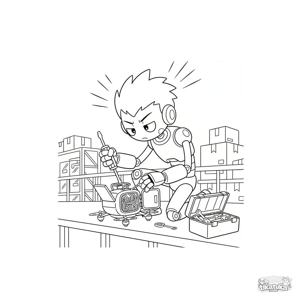 Ausmalbild für Kinder 7-9: Ein cooler Roboter-Mechaniker im Manga-Stil repariert konzentriert eine kaputte Frachtdrohne auf einem Lagersteg. Dynamische Linien, offener Werkzeugkasten.