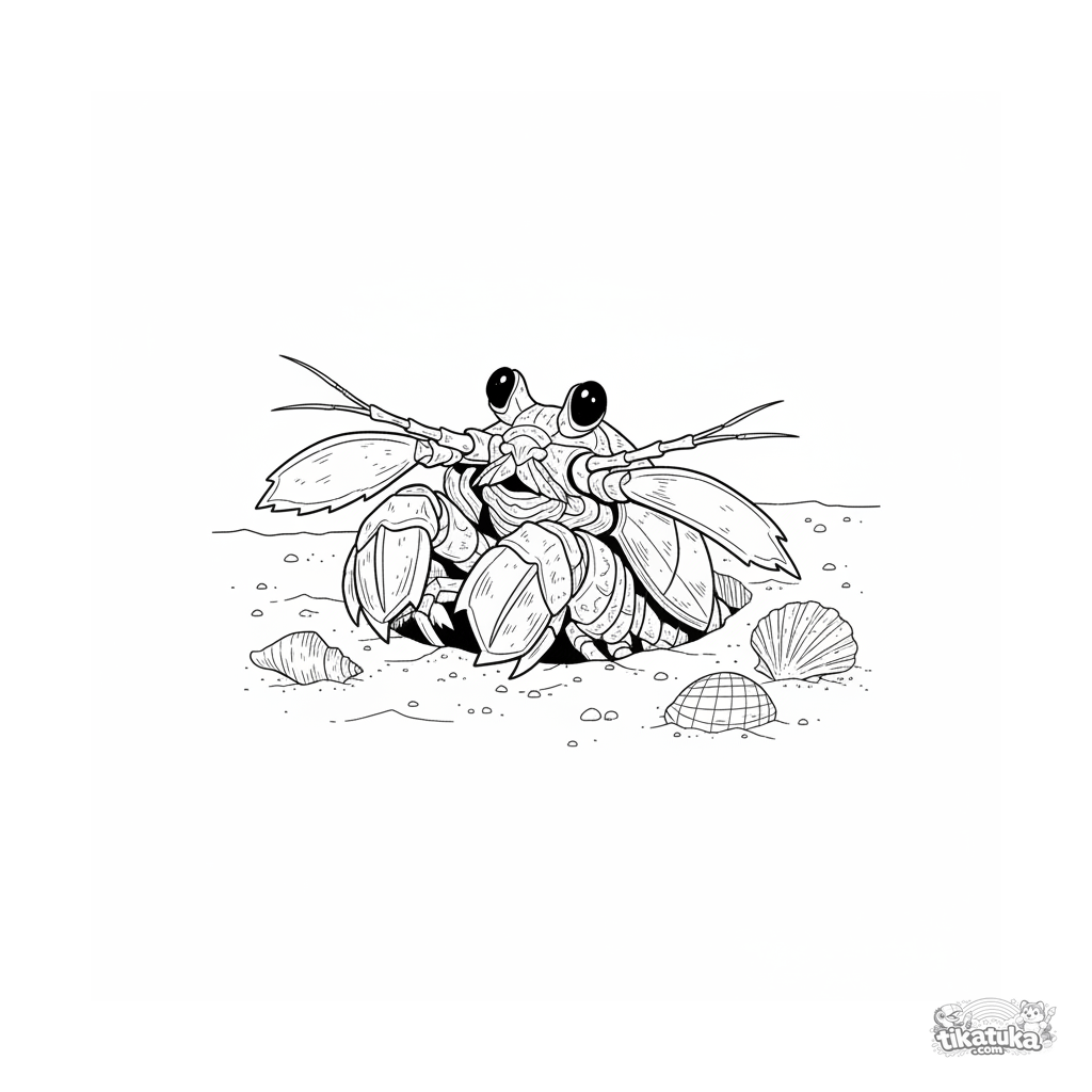 Detailliertes Ausmalbild für 10-12 Jahre: ein Fangschreckenkrebs lugt aus seiner Höhle im sonnigen Flachwasser. Vintage-Gravurstil mit klaren Konturen.