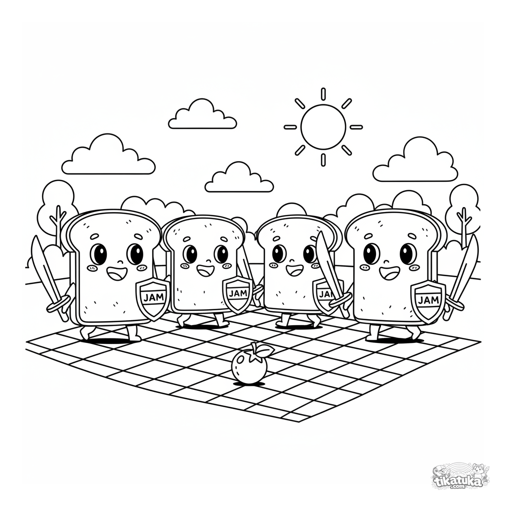 Ausmalbild von marschierenden Toast-Soldaten beim Picknick. Lustige Toasts mit Marmeladeschildern. Für Kinder von 4-6 Jahren.