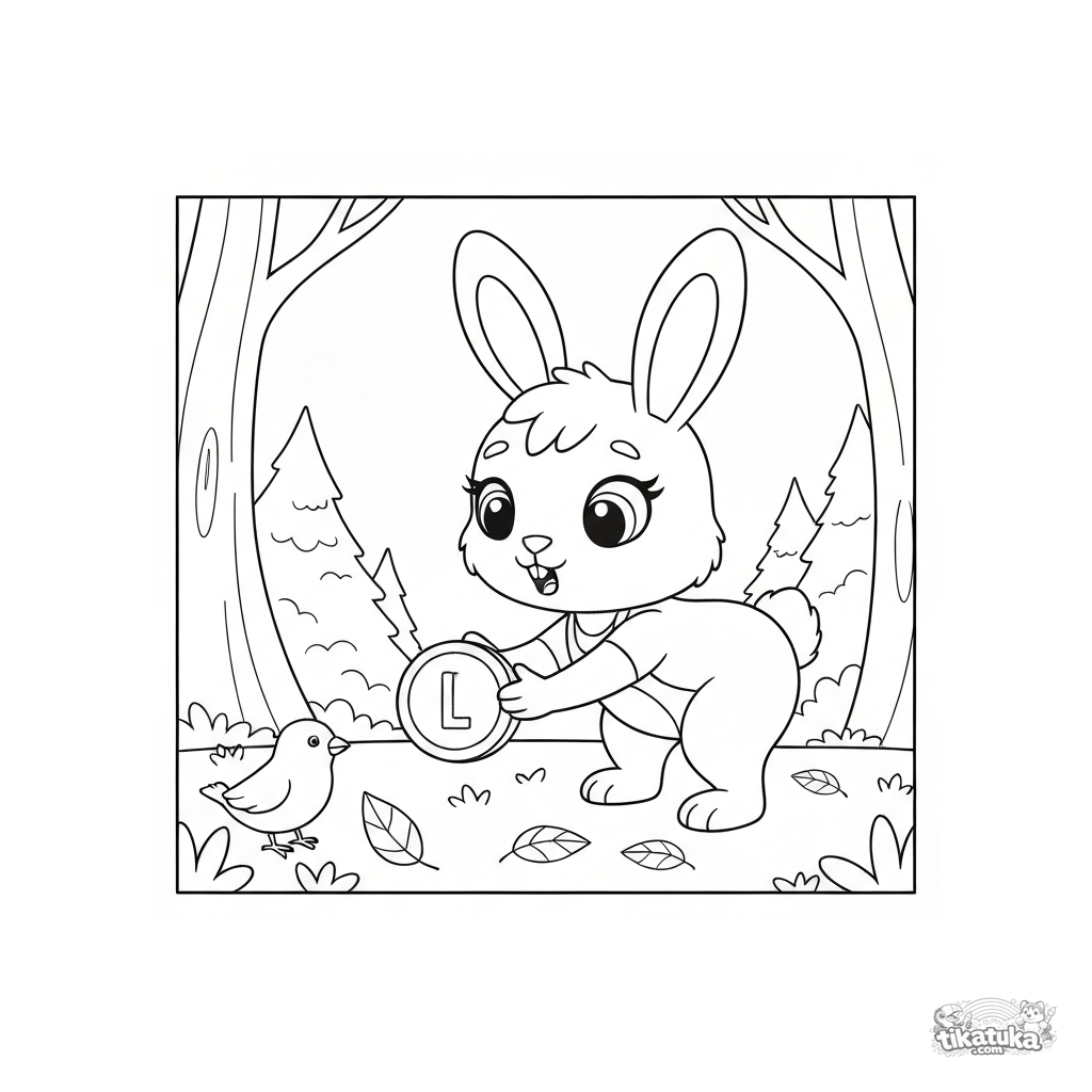 Entdecke Malspaß! Häschen Martha findet überrascht eine Münze im Herbstwald. Zum Download, Ausdrucken oder Online-Ausmalen.