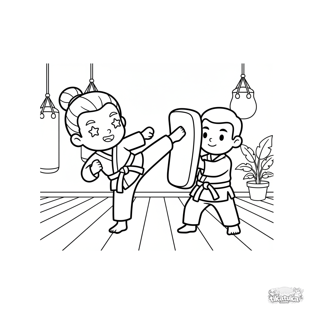 Ausmalbild für Kinder 4-6: Ein Kampfkünstler in einem weißen Gi führt einen hohen Seitentritt gegen ein Übungsziel in einem Dojo aus. Eine Szene von Kraft und Disziplin.