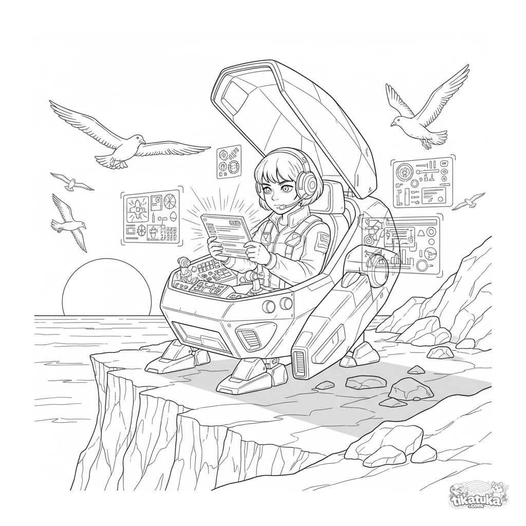Detailliertes Anime-Ausmalbild: Ein Mecha-Pilot führt Diagnosen in einem offenen Cockpit an einer Küstenklippe bei Sonnenuntergang durch. Für 10-12 Jahre, mit komplexem Hintergrund, Hologrammen und Schemata.