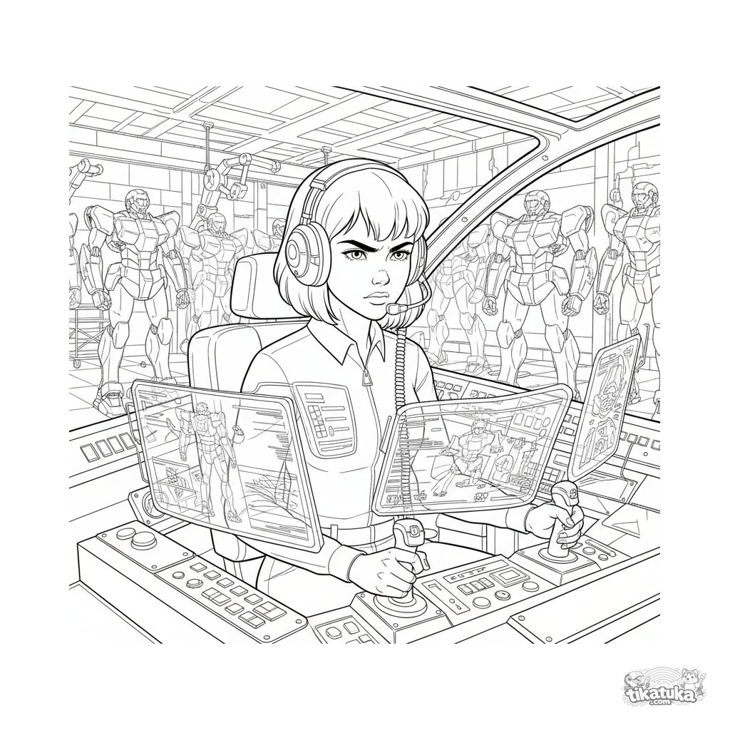 Komplexes Anime-Ausmalbild: Ein Pilot im Cockpit eines Riesen-Mechas führt Systemchecks durch. Sehr detaillierte Szene für ältere Kinder von 10-12 Jahren.