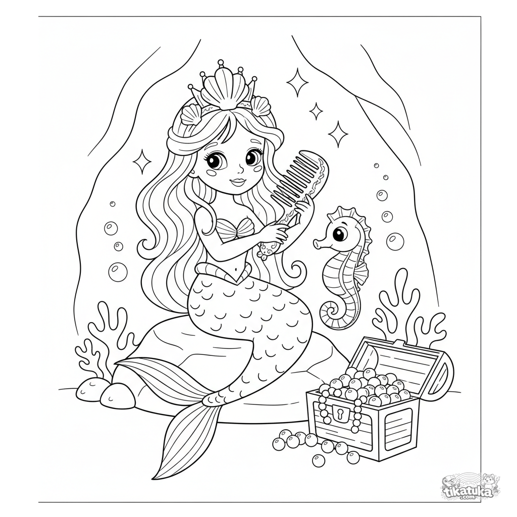 Ausmalbild für Mädchen 4-6: Eine Meerjungfrau-Prinzessin kämmt ihre Haare in einer Korallenhöhle mit einem Seepferdchen. Magische Unterwasserszene.