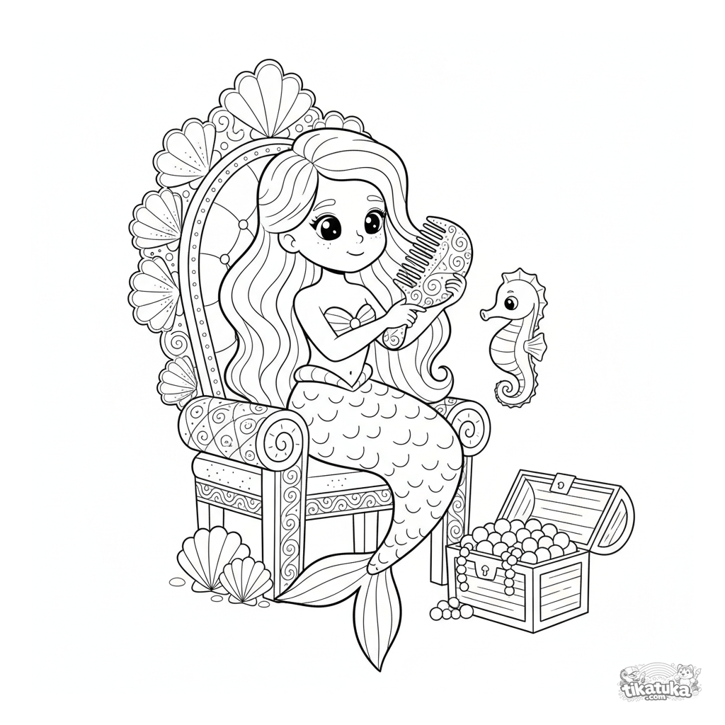 Ausmalbild einer Meerjungfrau-Prinzessin, die sich auf einem Korallenthron die Haare kämmt. Für Mädchen von 6 bis 9 Jahren.