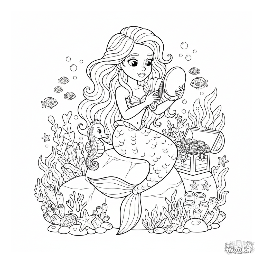 Ausmalbild einer Meerjungfrauen-Prinzessin, die sich im Korallenriff die Haare kämmt. Für Mädchen von 6-9 Jahren. Detaillierte Szene mit Schatz und Seepferdchen.