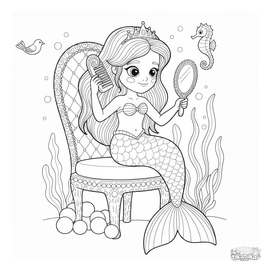 Ausmalbild einer Meerjungfrau-Prinzessin, die sich auf einem Korallenthron die Haare kämmt. Für Kinder von 6-9 Jahren.