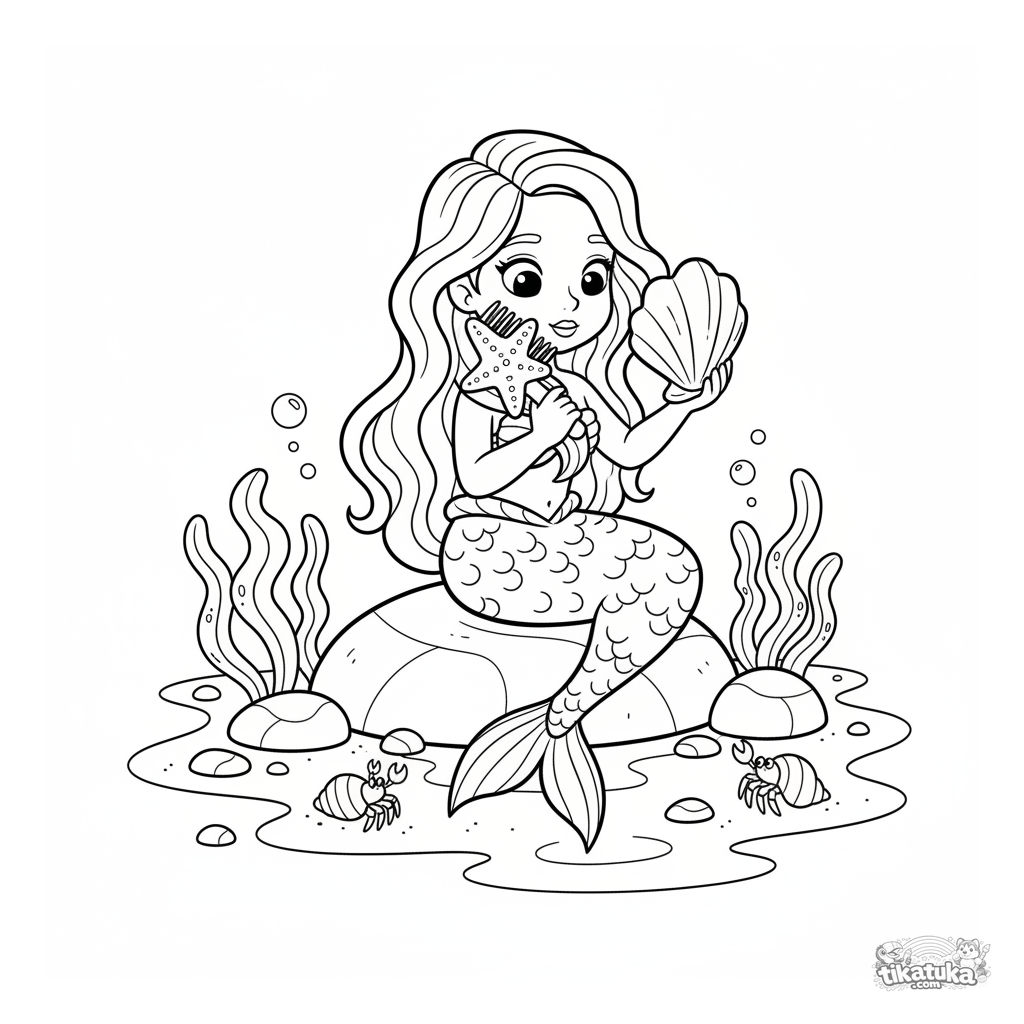 Ausmalbild für Mädchen 4-6: Eine Meerjungfrau-Prinzessin kämmt sich mit einem Seesternkamm die Haare und schaut in einen Muschelspiegel in einem felsigen Gezeitentümpel. Magische Szene.