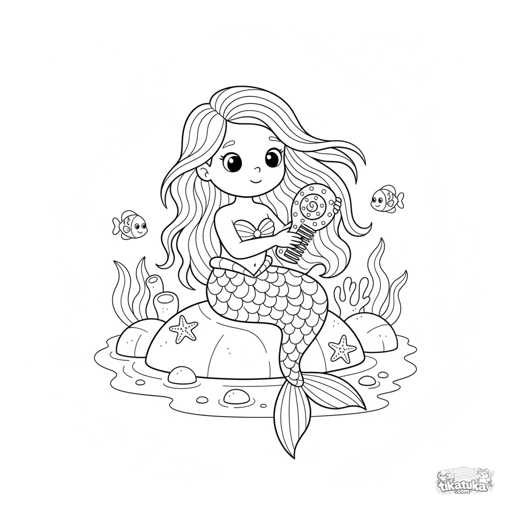 Ausmalbild für Mädchen 4-6: Eine Meerjungfrau-Prinzessin kämmt sich mit einem Muschelkamm auf einem Felsen in einem Gezeitentümpel.