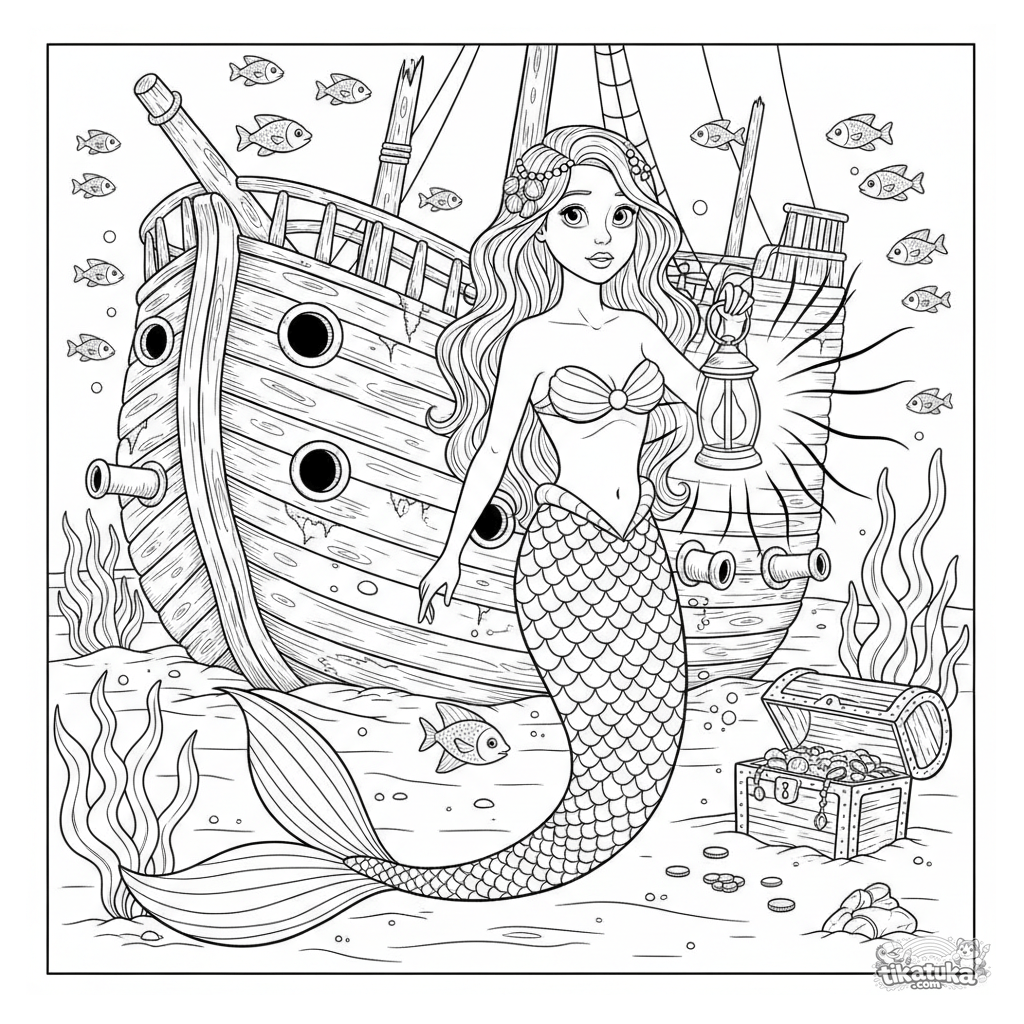 Detailliertes Ausmalbild für Kinder 10-12: Eine Meerjungfrauen-Prinzessin mit Laterne erkundet ein gesunkenes Holzschiff in der Tiefsee.