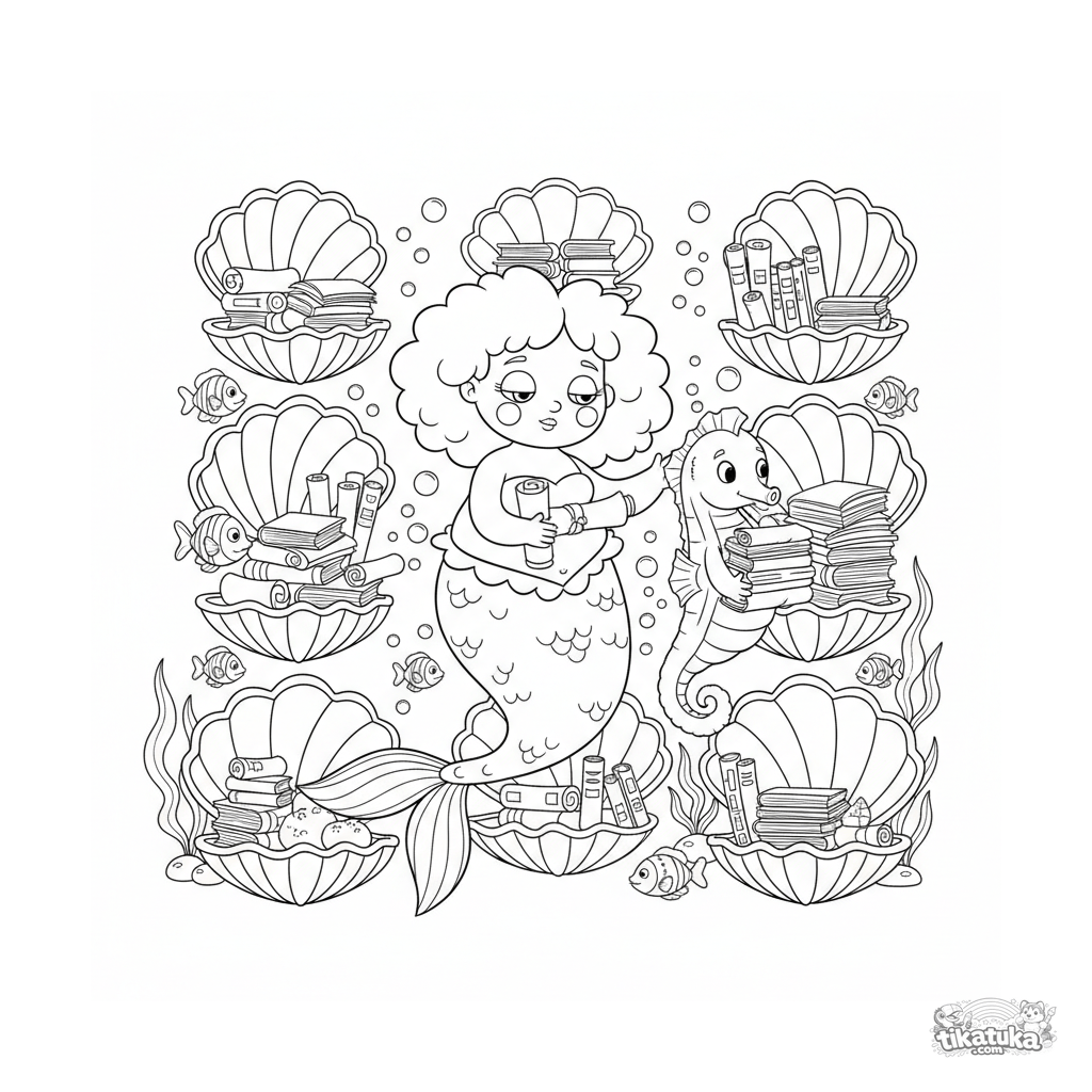 Ausmalbild für Kinder 4-6: Eine Meerjungfrauen-Prinzessin sortiert eine Unterwasserbibliothek aus Korallen und Muscheln, ein Seepferdchen hilft.