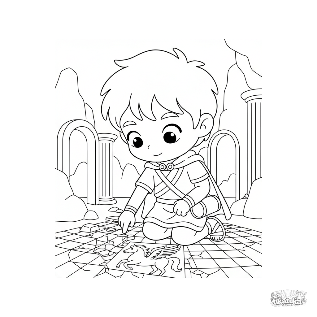 Ausmalbild für Kinder 4-6: ein Botenjunge erkundet den Mosaikboden in der Gorgonenhöhle. Heller, klarer Anime-Stil, perfekt für Vorschulkinder.