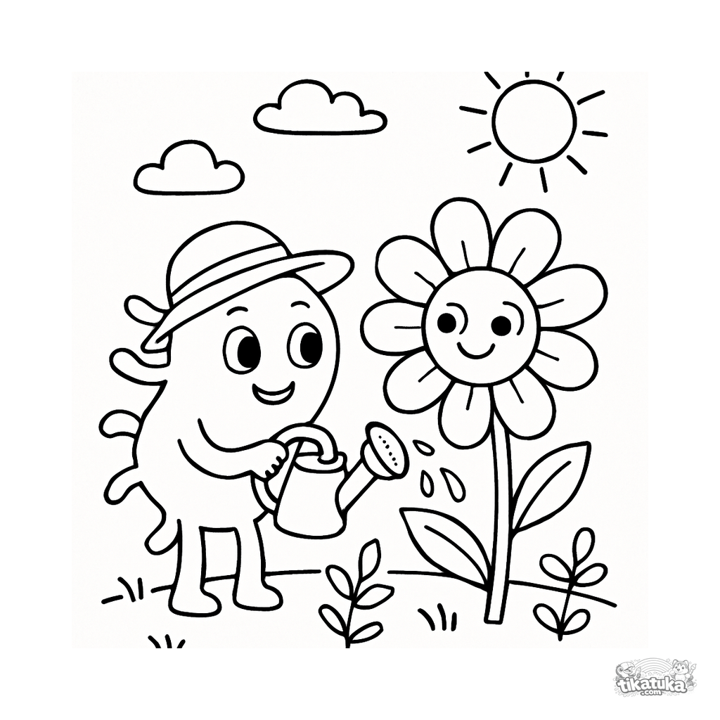 Ausmalbild für Kinder. Freundliche Mikrobe mit Sonnenhut gießt lächelnde Blume mit Gießkanne, kleine Pflanzen und Sonne im Hintergrund. Kostenlos herunterladen.
