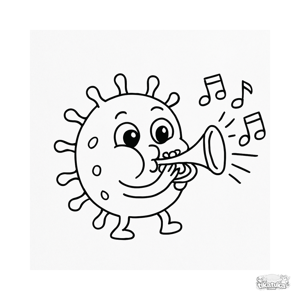 Ausmalbild für Kinder. Eine fröhliche Mikrobe mit aufgeblasenen Wangen spielt eine glänzende goldene Trompete mit bunten Musiknoten. Kostenlos herunterladen.