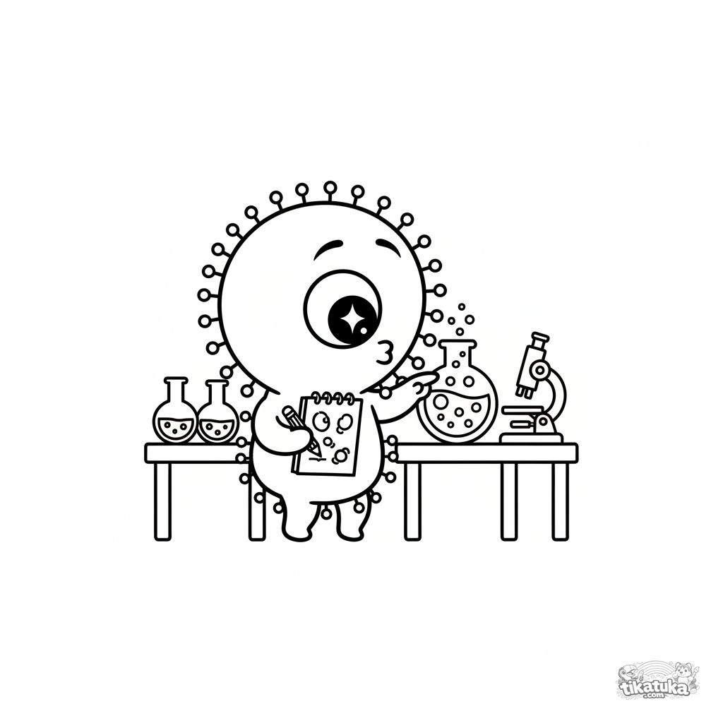 Sehr einfaches Ausmalbild für Kleinkinder 2-3: Ein Mikroben-Wissenschaftler schaut in ein Becherglas im Klassenzimmer. Riesiger Kopf, minimale Details, Chibi-Stil.