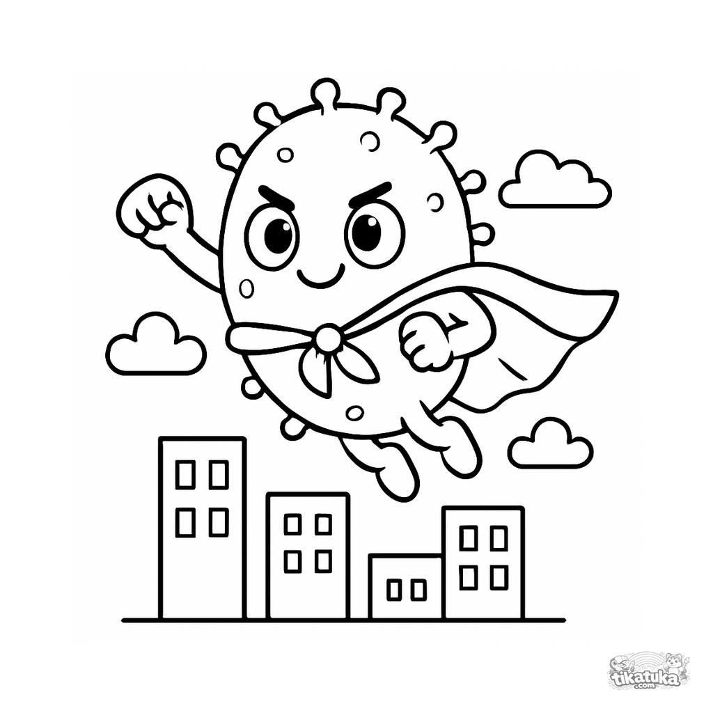 Ausmalbild für Kinder. Eine tapfere Mikrobe-Superheld mit rotem Umhang fliegt über winzige Gebäude mit ausgestreckter Faust. Kostenlos herunterladen.