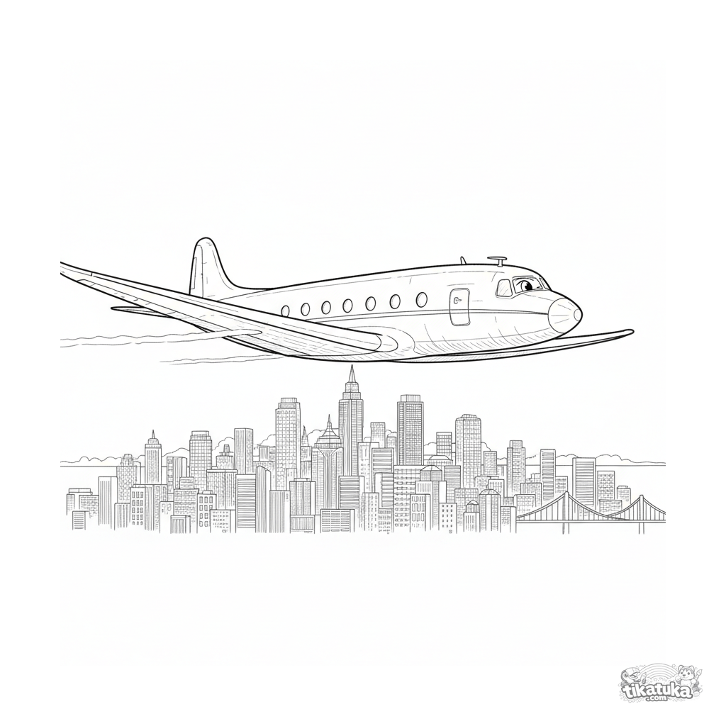 Detailliertes Ausmalbild eines Verkehrsflugzeugs aus der Mitte des Jahrhunderts im Landeanflug über einer Stadt bei Sonnenuntergang. Für Kinder von 10-12 Jahren.