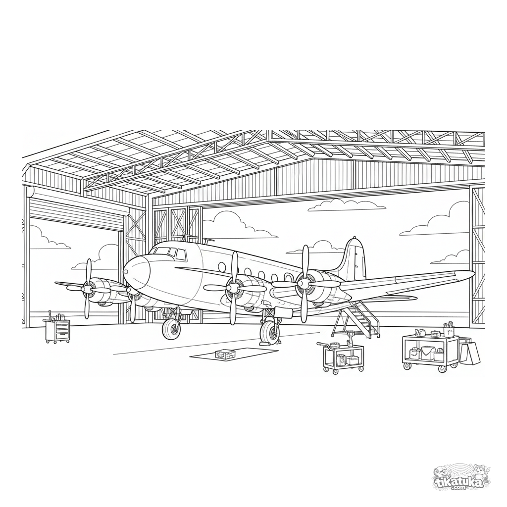 Ausmalbild eines eleganten Passagierflugzeugs der 1950er Jahre, das in einem offenen Hangar geparkt ist. Treppe und Wagen sind sichtbar. Für Kinder von 4-6 Jahren.