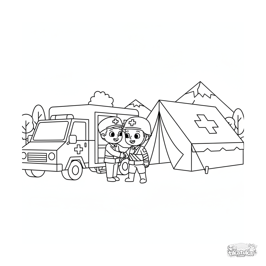 Ausmalbild für Kinder 4-6: Ein Militärkrankenwagen mit rotem Kreuz steht an einem Feldlazarettzelt im Lager. Ein Sanitäter hilft einem bandagierten Soldaten.