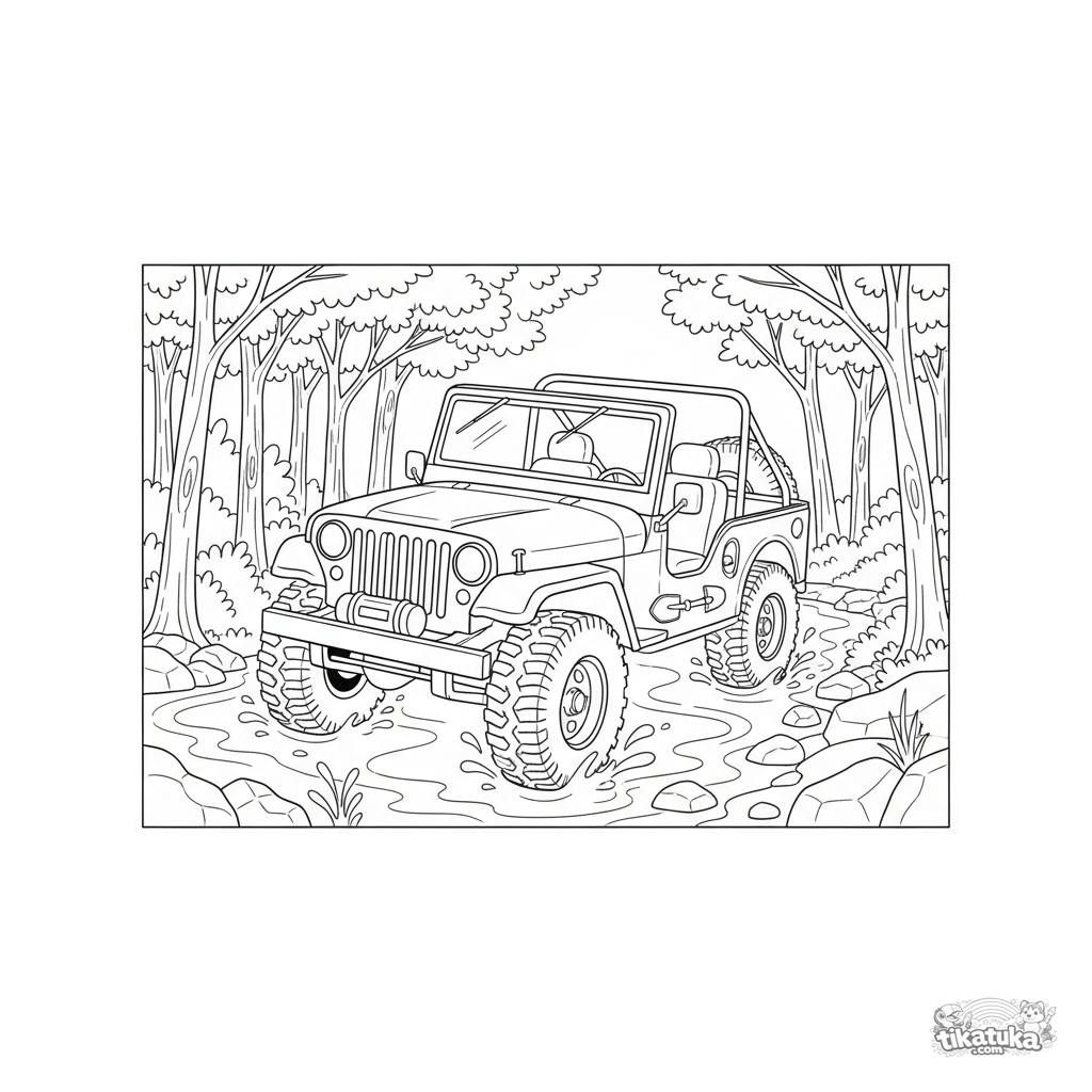Ausmalbild für Jungen von 4-6 Jahren mit einem Militär-Jeep. Das Fahrzeug fährt durch einen flachen, steinigen Bach in einem Wald und erzeugt Spritzer.