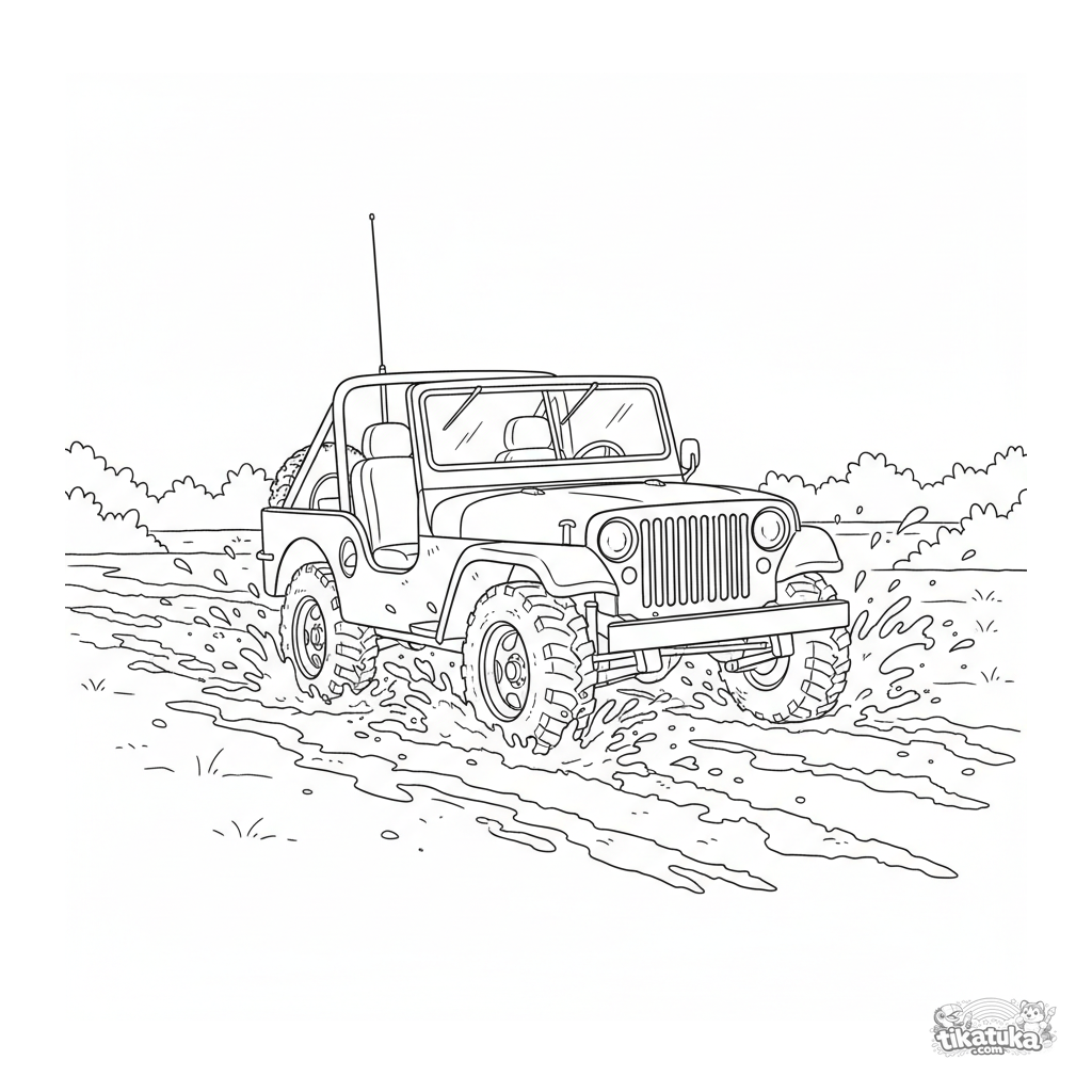 Ausmalbild eines Militär-Jeeps, der durch ein Schlammfeld fährt. Für Jungen von 4-6 Jahren. Actiongeladene Fahrzeugszene.