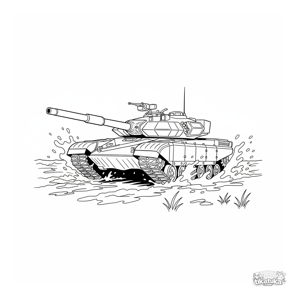 Ausmalbild für Jungen 4-6: ein Militärpanzer fährt durch ein schlammiges Feld. Mittlerer Schwierigkeitsgrad, realistische Details, für Fahrzeugfans.