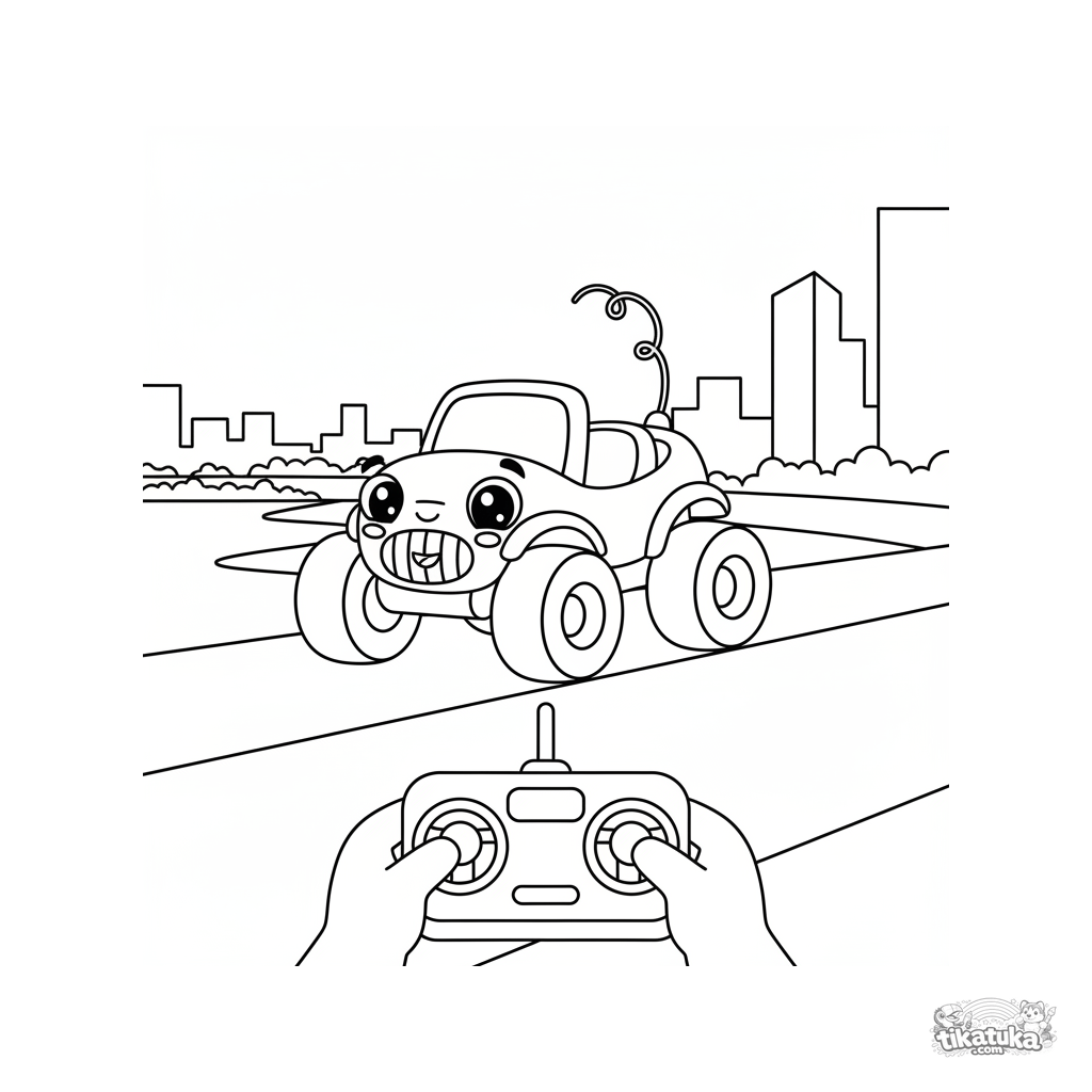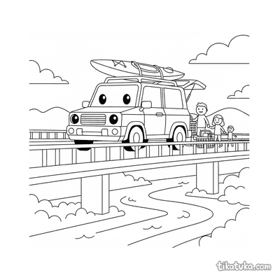 Malmalvorlage für Kleinkinder: ein kleines ferngesteuertes Auto auf der Brüstung einer großen Brücke über einem Fluss.