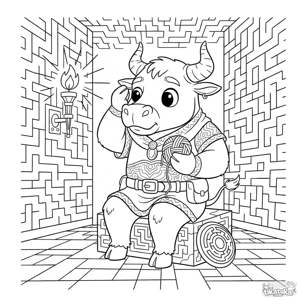 Ausmalbild für ältere Kinder: Ein sanfter Minotaurus-Wächter sitzt im Labyrinth mit einem Knäuel Faden. Eine Rätselszene aus alten Mythen mit Details.