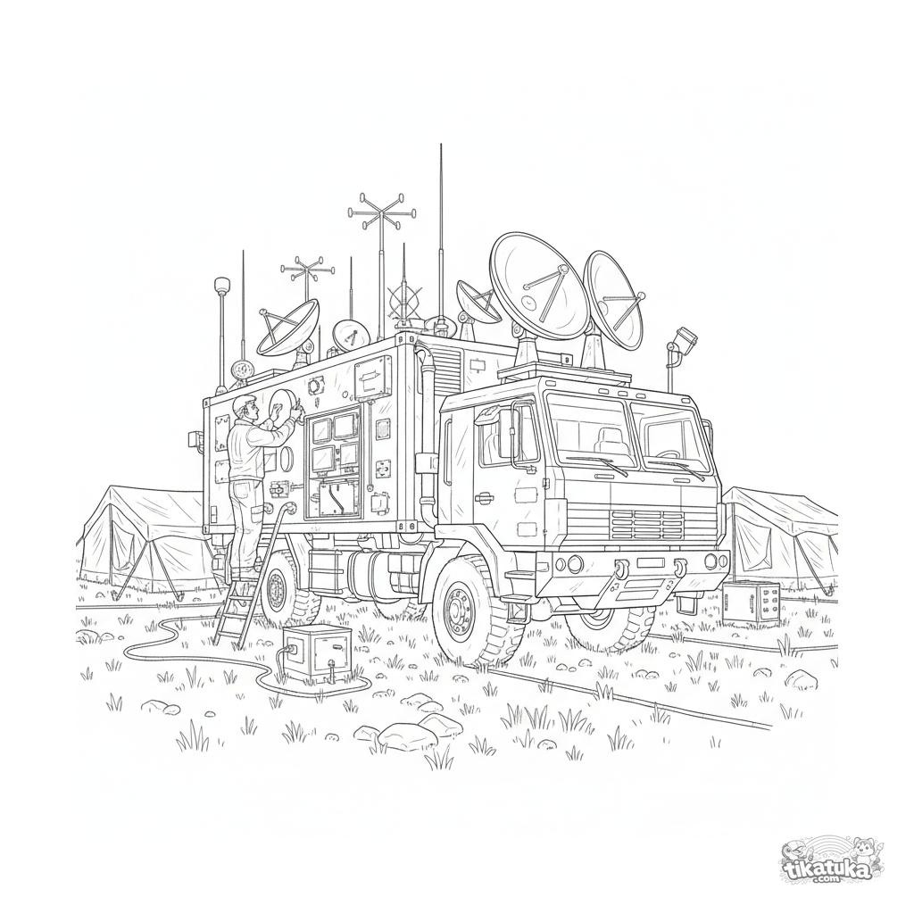 Ausmalbild für ältere Kinder 10-12: Ein detaillierter mobiler Kommandozentrum-Laster, bedeckt mit Antennen und Schüsseln. Ein Techniker auf einer Leiter justiert die Ausrüstung nahe den Hauptquartierzelten.