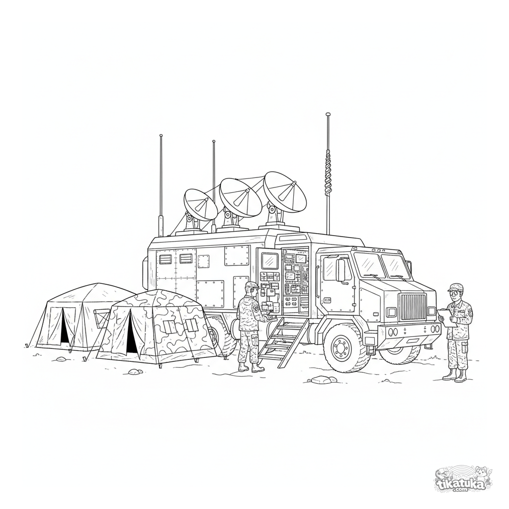 Ausmalbild für ältere Kinder 10-12: Ein detaillierter mobiler Kommandozentrum-LKW mit Antennen ist in der Nähe eines Feldhauptquartiers geparkt. Soldaten bereiten die Ausrüstung vor.