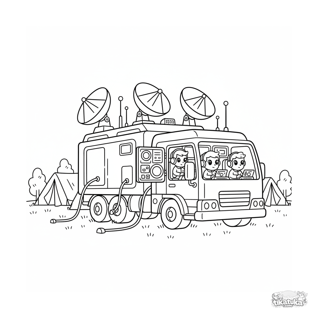 Ausmalbild eines futuristischen mobilen Kommandostand-Lasters im Feldlager. Für Kinder 7-9. Laster mit Antennen und Satellitenschüsseln, Techniker arbeiten innen, Kabel und Zelte rundherum.