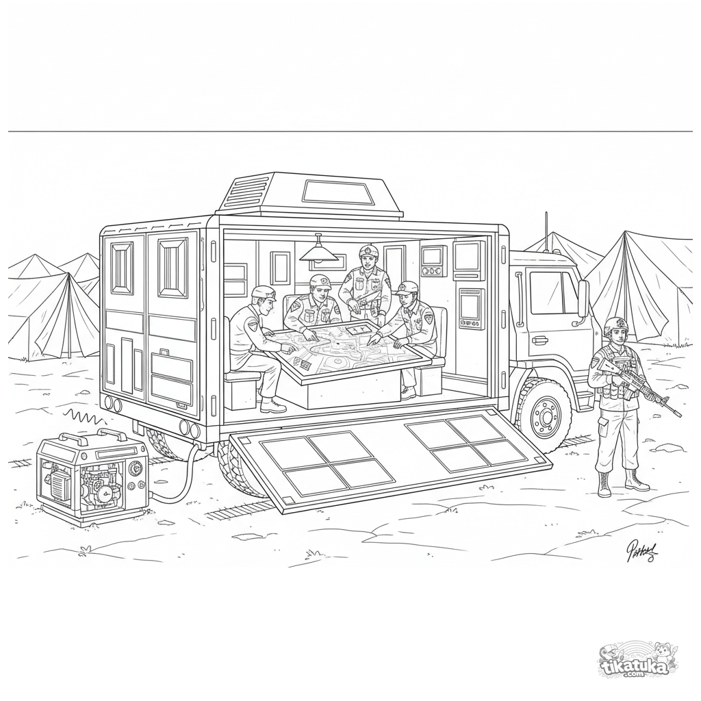 Komplexes Ausmalbild eines mobilen Kommandozentrums mit ausgeklappten Seiten. Für ältere Kinder von 10-12 Jahren.