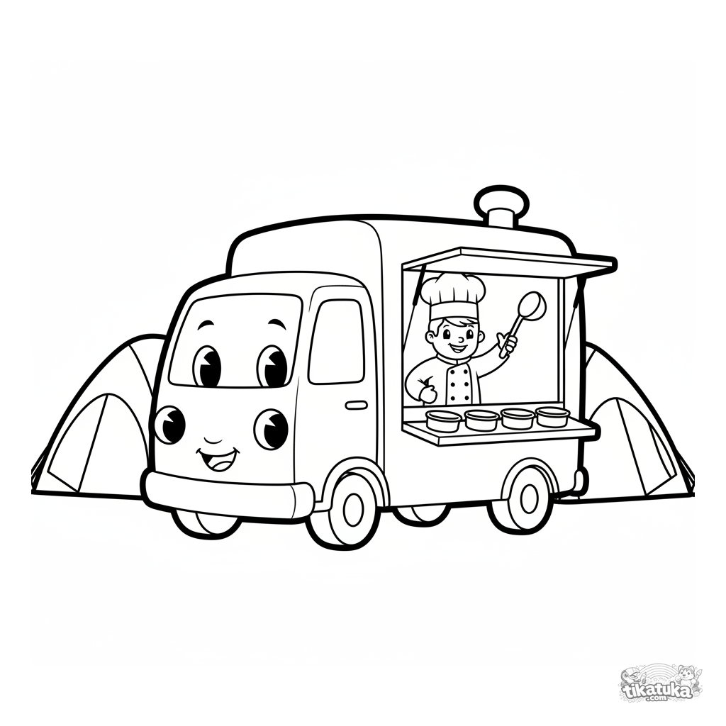 Einfaches Ausmalbild einer Feldküche auf einem Laster für Kleinkinder 2-3. Große, einfache Formen: Fahrzeug, Zelte, fröhlicher Koch mit Schöpflöffel. Weite Ränder zum Ausmalen.