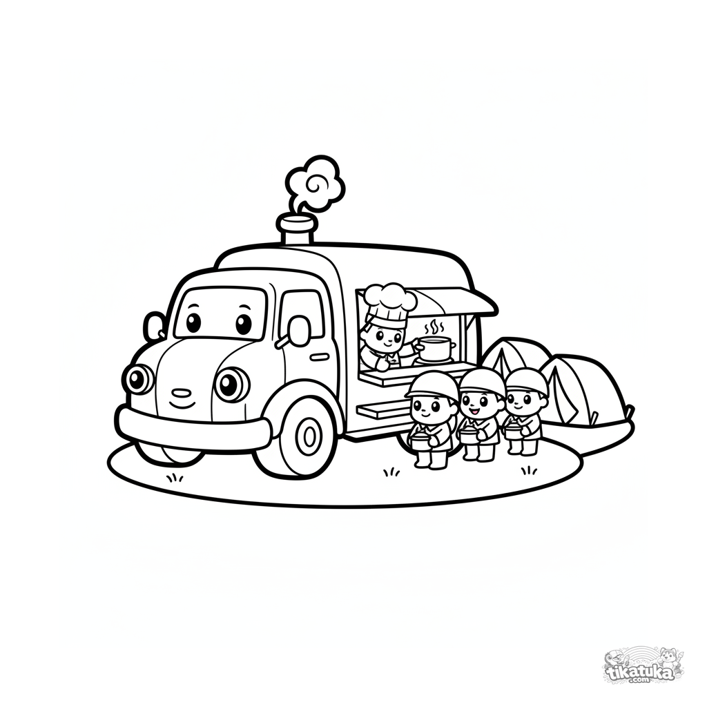 Ausmalbild für Kleinkinder eines Feldküchen-LKWs. Für 2-3 Jahre.