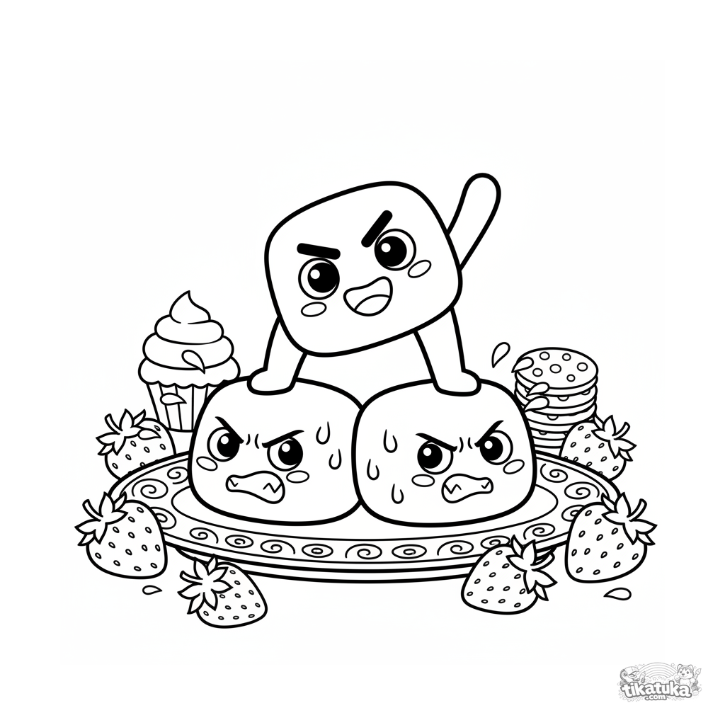 Ausmalbild für Kinder 7-9 Jahre. Drei Erdbeer-Mochis bauen eine Pyramide auf einem Teller. Dynamische Szene im 90er-Cartoon-Stil.