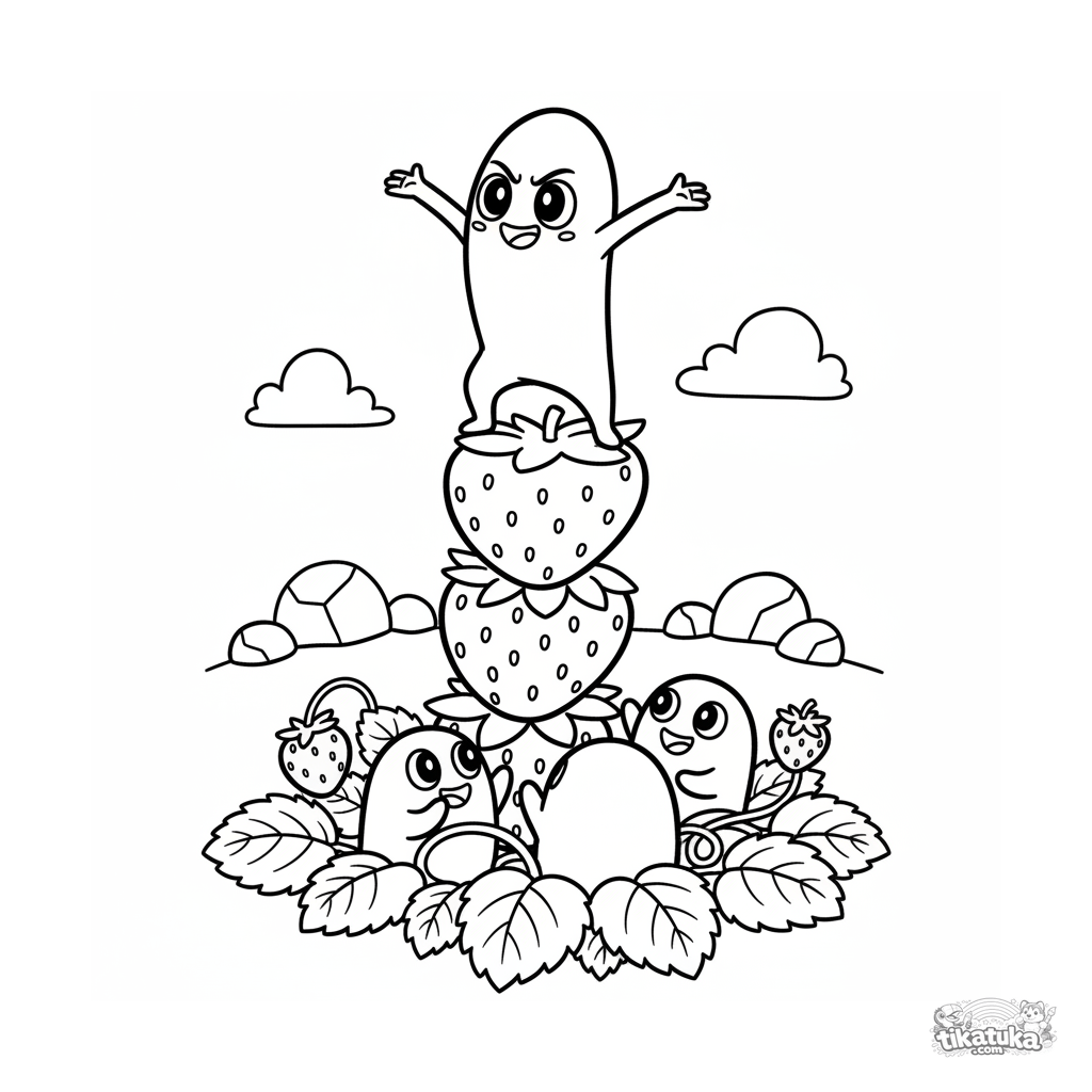 90er-Stil Ausmalbild: Ein Erdbeer-Mochi balanciert auf einem Beerenturm. Dynamische Szene für Kinder von 7-9 Jahren, mit zuschauenden Freunden.