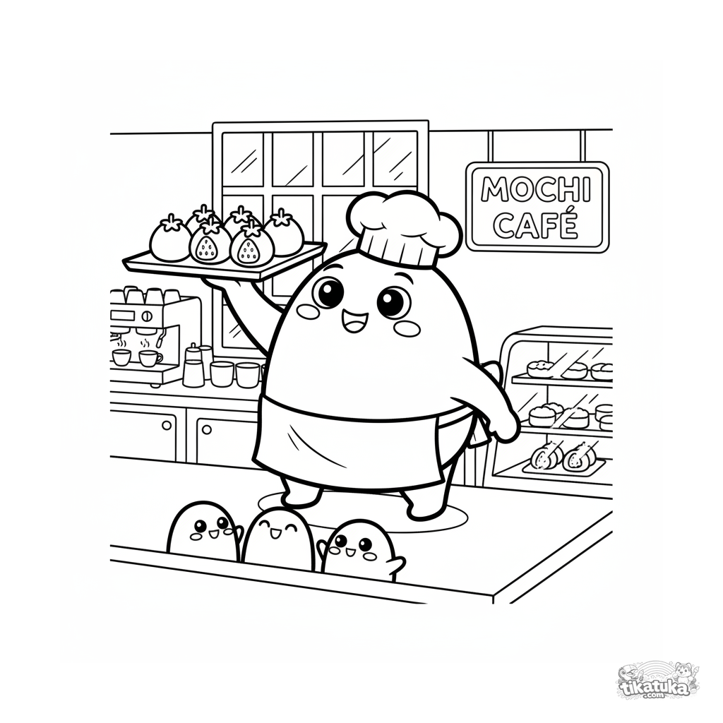 Ausmalbild für Kinder 7-9: ein Mochi-Koch mit Hut und Schürze präsentiert ein Tablett mit Erdbeer-Mochi in einem Café. Detaillierte Szene.