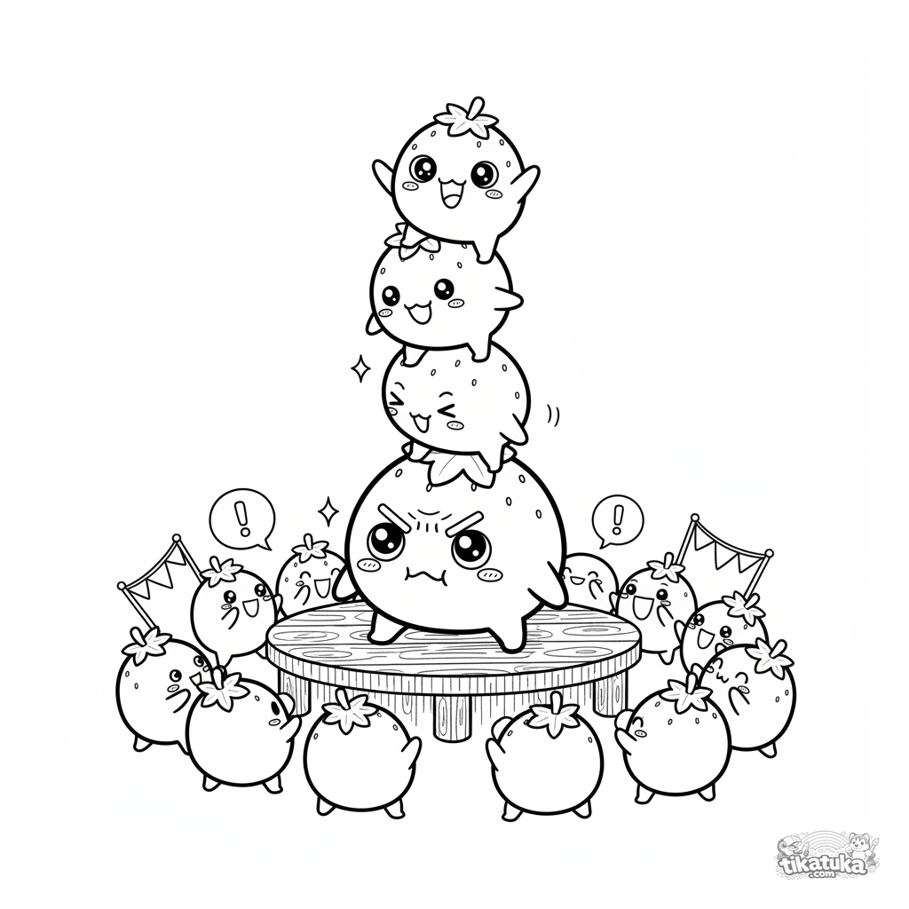 Ausmalbild für Tweens 7-9: ein Turm aus Mochi-Akrobaten tritt auf einer Holzbühne für Publikum auf. Dynamische Szene.