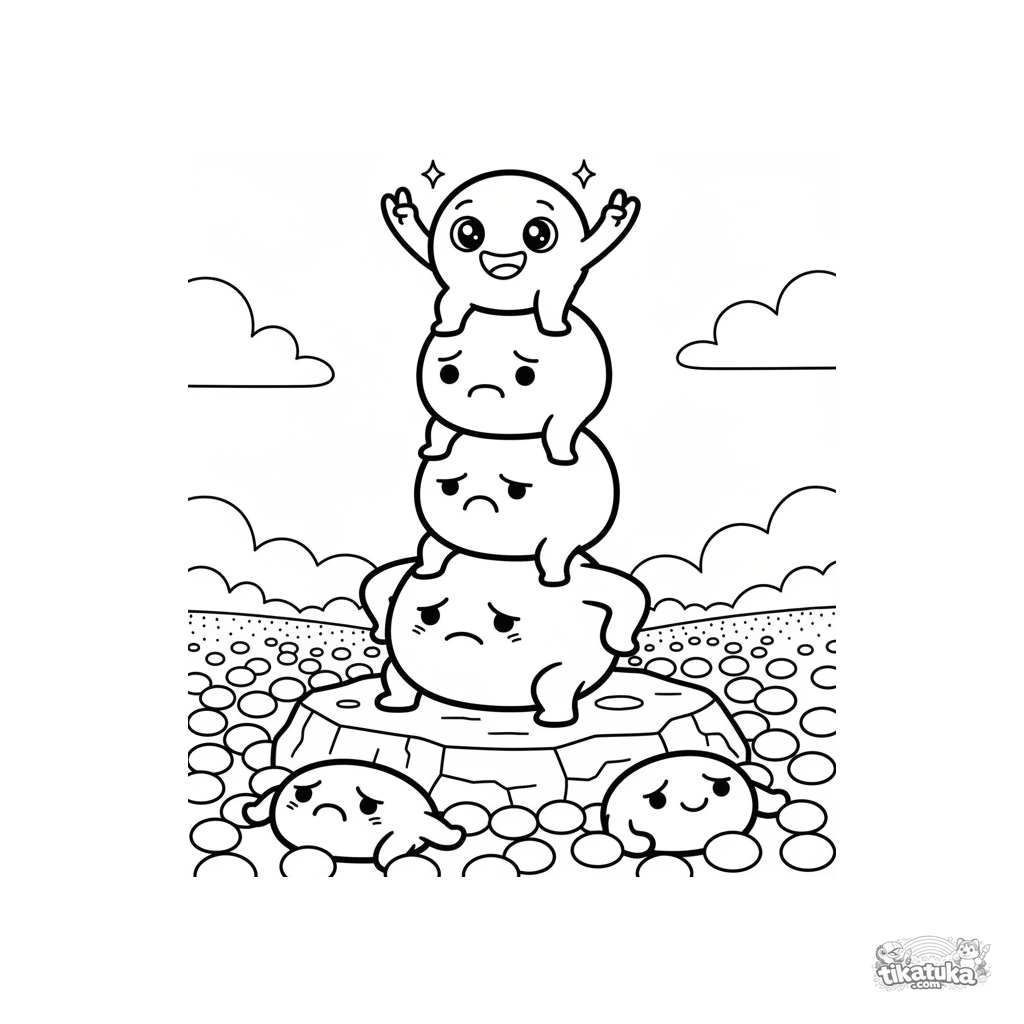 Ausmalbild für Tweens 7-9: ein wackeliger Turm aus verschiedenen Mochi, die versuchen, das Gleichgewicht zu halten. Eine dynamische und lustige Szene über Teamwork.