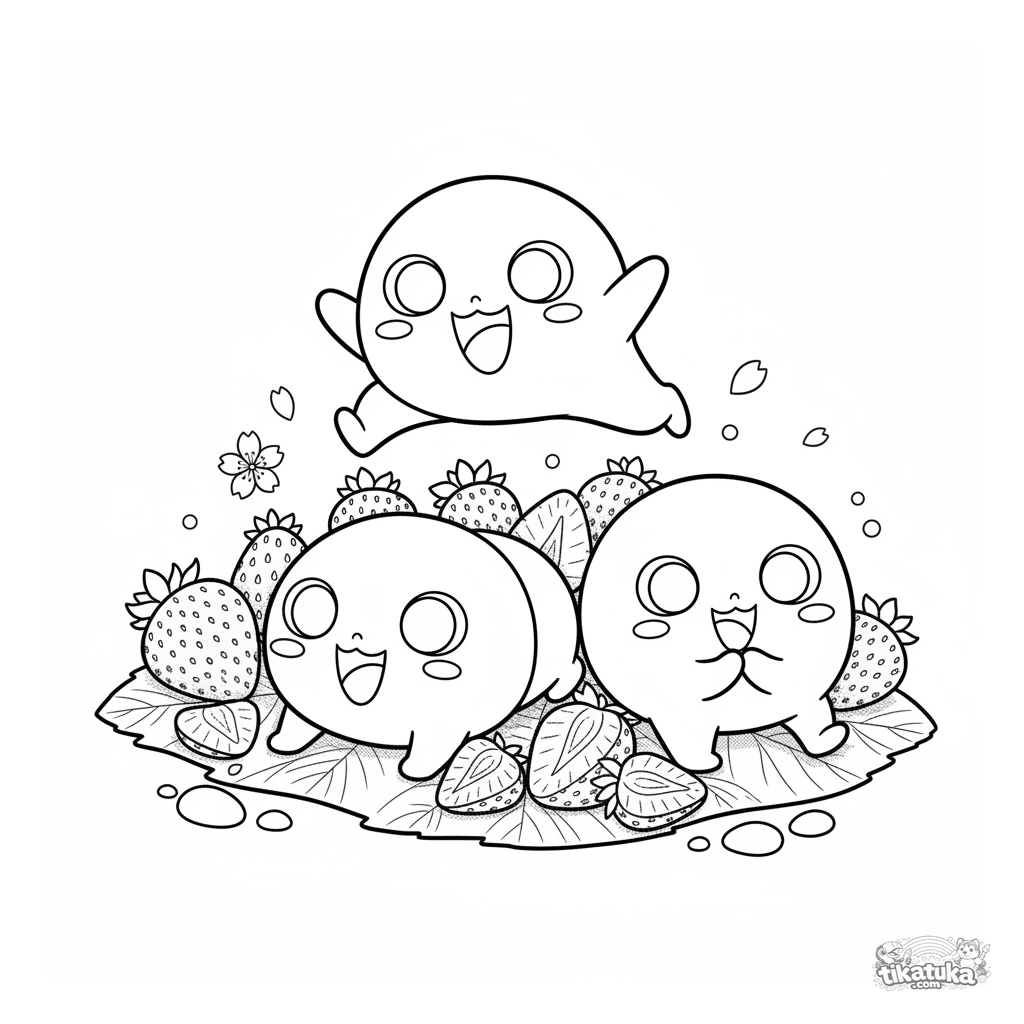 Ausmalbild für Tweens 7-9: Drei verspielte Mochi spielen Bockspringen zwischen Erdbeeren auf einem Blattteppich. Dynamische Szene mit verschiedenen Posen.