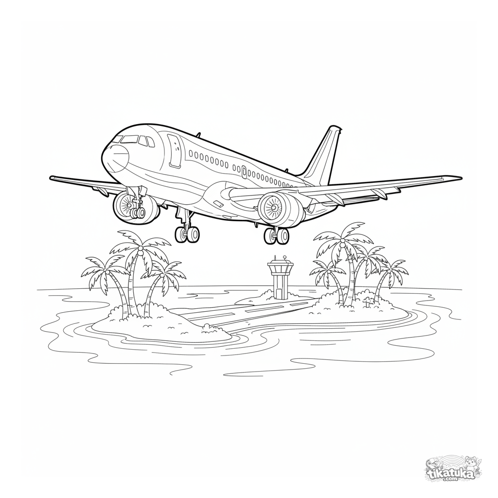 Ausmalbild eines modernen Passagierflugzeugs im Landeanflug auf eine Tropeninsel. Für 7-9 Jahre. Mit Lagune, Palmen und Landebahn.